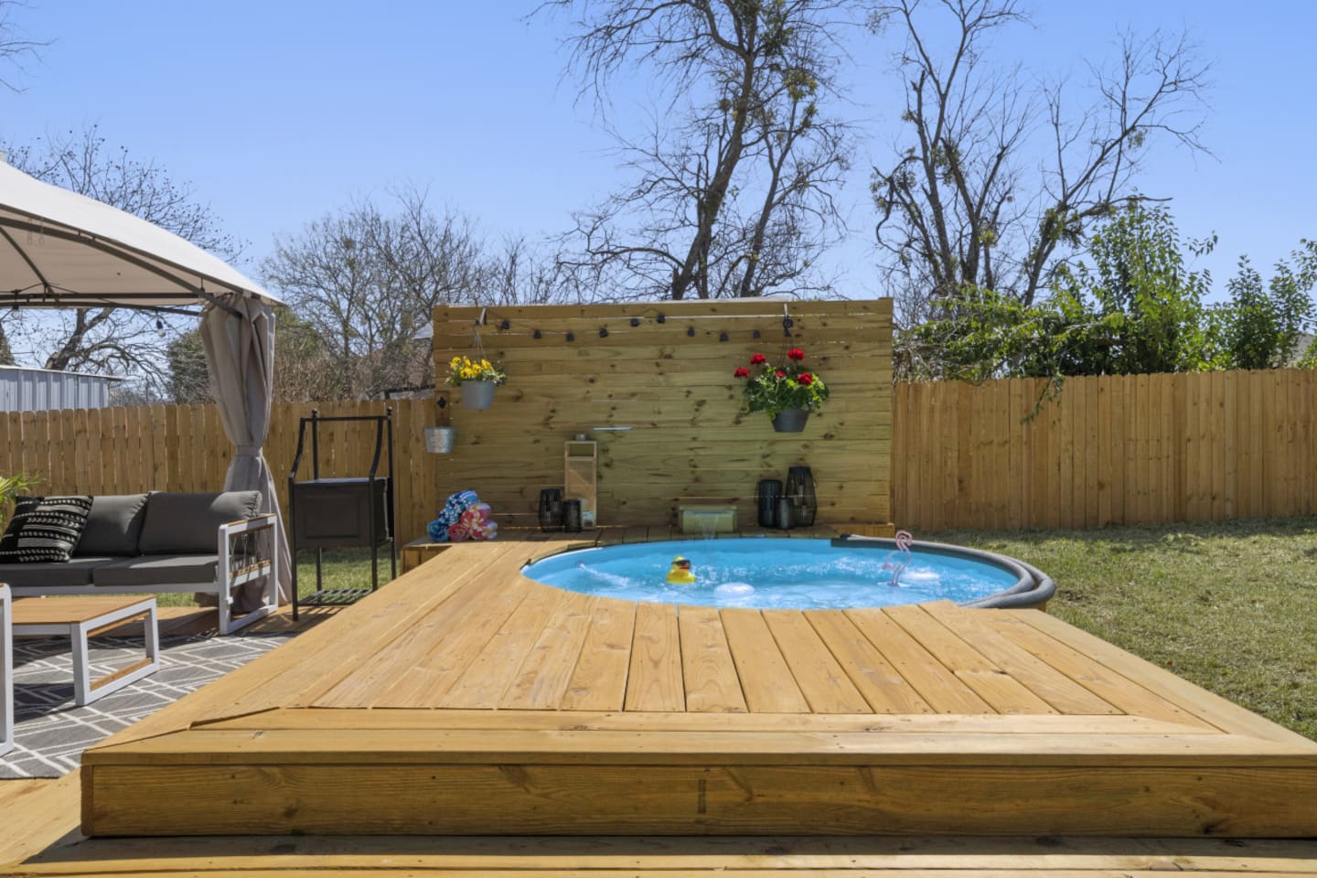 Amenities ●Cowboy Pool 8ft wide 1' 1/2" deep Heated during winter season (80-100 Fahrenheit) not a hot tub mid October - April Cold from April until -mid October ●Firepit area ● Pack and Play w/ Highchair ●2 minutes/1 mile to the Silos, Mclane Stadium and Cameron Park & Zoo ●Wi-Fi with Netflix, Disney +, Hulu, Amazon Prime ●2 Queen Beds in 1st Bd ●King Bed in 2nd Bd ●King Bed in 3rd Bd ●Trundle day bed with 2 twins in 4th Bd ●Fully Stocked Kitchen with a coffee machine, pots, pans, basic seasoning, mugs, plates, and much more ●Washer & Dryer ●Fully fenced w/ Self Check In ●Gas Burner Grill ●Pet friendly